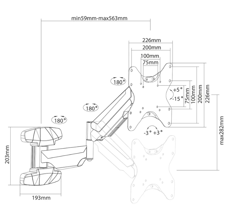 | Регулируема дължина | Width: 22.6 cm, Height: 32.7cm; Height adjustment: 0 - 28.2 cm, Gasspring; Distance to wall: 5.9 - 56.3 cm |