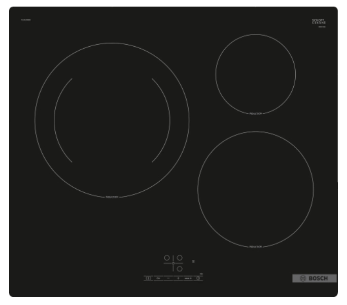 | Брой зони за готвене | 3 induction zones (28 cm cooking zone), 17 power levels (9 main and 8 intermediate levels) |