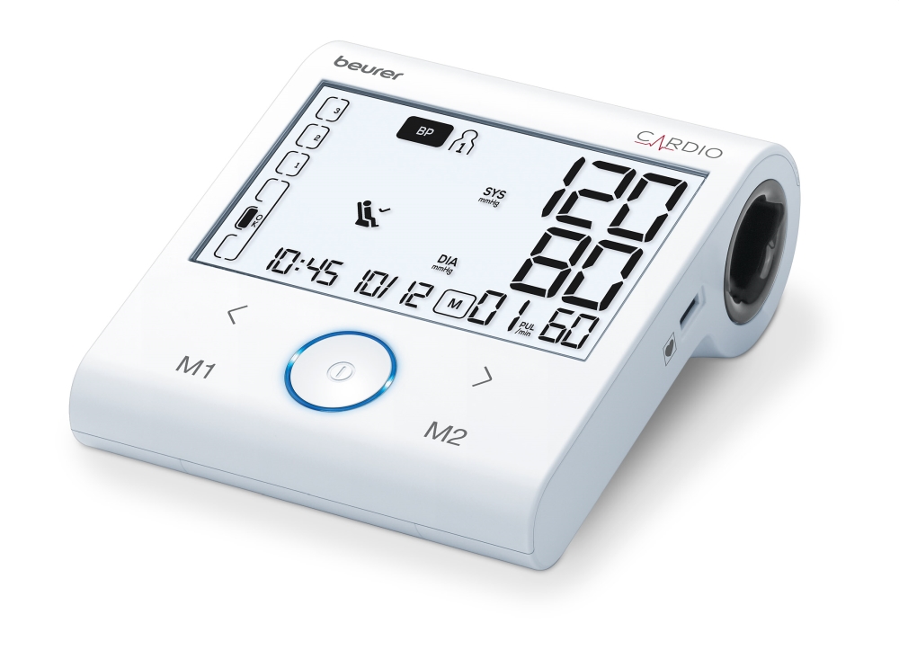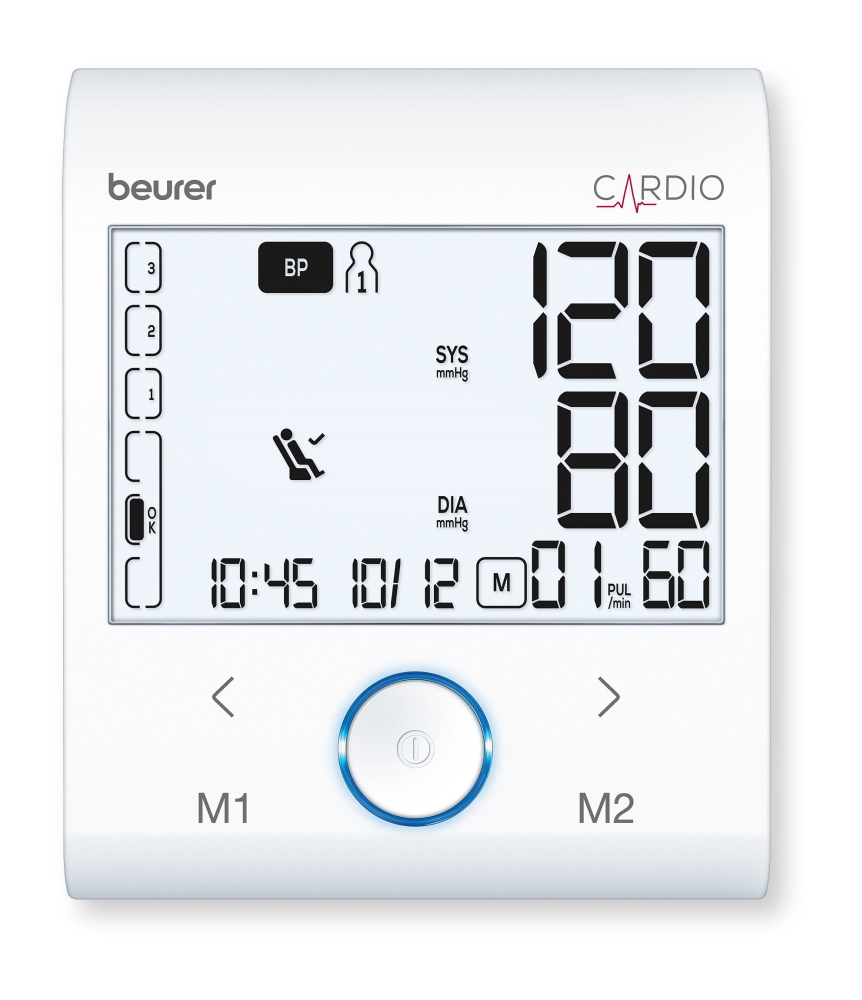 Апарат за кръвно налягане, Beurer BM 96 Cardio BT Blood pressure monitor with ECG; AFib + PVC detection; Inflation technology; Bluetooth; white illuminate XL display; 1-channel ECG for recording heart rhythm with practical ECG stick; 2 users ; risk indicator; arrhythmia detection