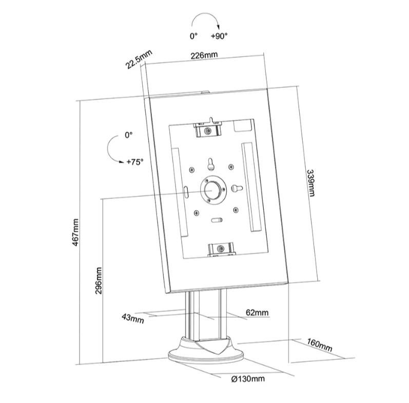| Други | VESA 75x75 mm - Countertop tablet holder that can rotate 90° to switch between portrait and landscape orientation; Anti-theft lock; Dimensions: 22.6 x 16 x 46.7 cm; Anti-skid pads protect the tablet from any scratches; Cable management system |