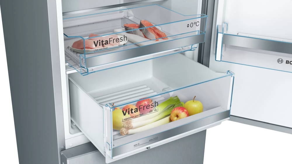 | Хладилник с фризер и VitaFresh 0°C Box: особено ефикасен - запазва вашето месо и риба свежи до два пъти по-дълго. VitaFresh: запазва храната свежа за по-дълго в чекмеджета с контролиран климат при почти 0°C. LED осветление: осветява хладилника равномерно без блясък, през целия жизнен цикъл на уреда. Автоматично супер замразяване: оптимално за замразяване на по-малко количество храна, като същевременно и предпазва замразените ви продукти от размразяване, благодарение на това, че открива повишаване на температурата и автоматично я понижава. Чекмедже за замразена храна тип BigBox: за подреждане на контейнери за съхранение или за големи количества замразена храна. Полица EasyAccess: изтеглящ се стъклен рафт за още по-лесен достъп до продуктите в хладилника. |
