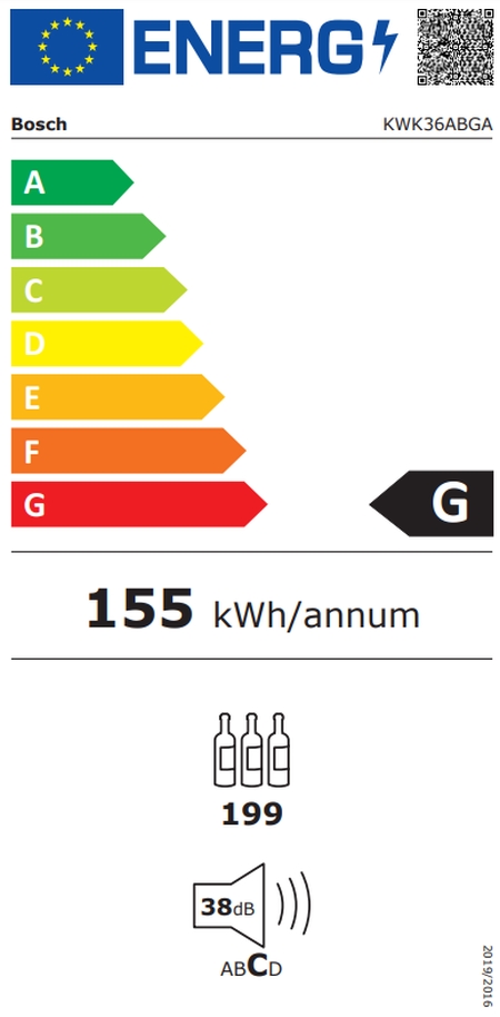 Шкаф за вино, Bosch KWK36ABGA SER6 Wine display case with glass door, G, 186 x 60 x 61 cm, Number of shelves - 10, Capacity for bottles of 750 ml - 199, Temperature range (° C) - 7-19 ° C, 38 dB (A), Number of temperature zones - 2