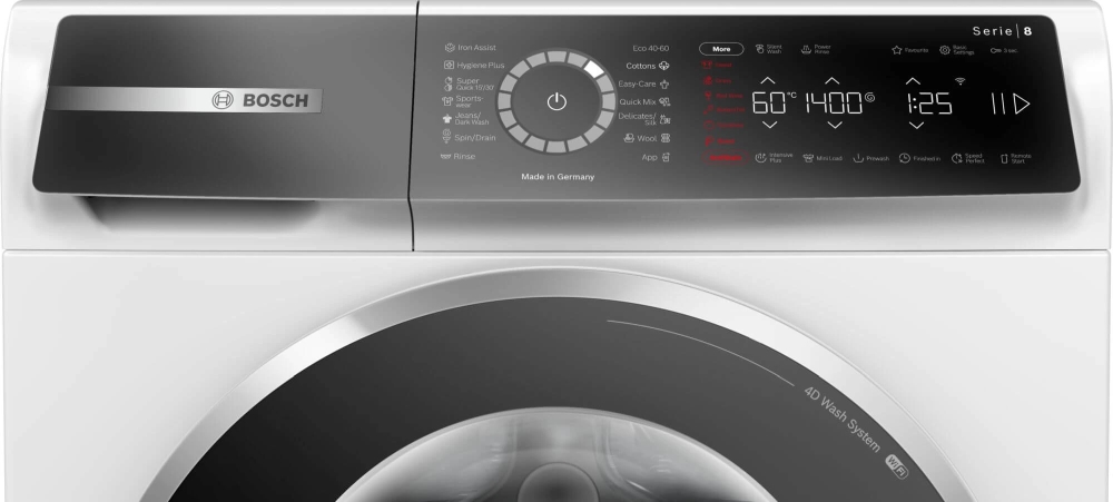 | Специални функции | Hygiene Plus, 4D Wash, AntiStain 4, EcoSilence Drive, AquaStop, SpeedPerfect, Home Connect, Sportswear program |