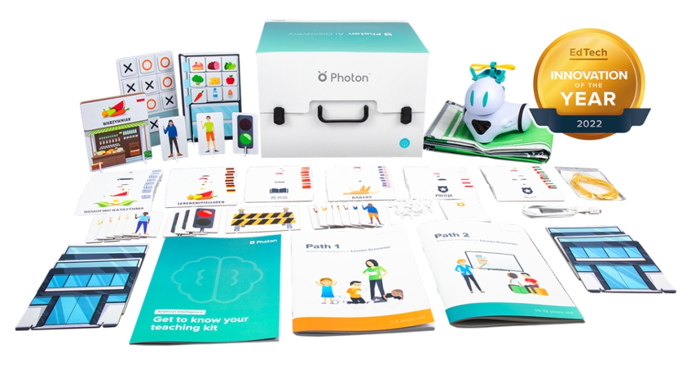 | Изкуственият интелект е една от най-важните и най-бързо развиващи се съвременни технологии в света. Като въвеждаме концепцията за изкуствен интелект (AI) в ранна възраст, ние предоставяме на децата знания, които ще им дадат значително предимство както в личния, така и в професионалния живот. Заради това този AI комплект от Photon е идеалният помощник за всеки модерен учител. Например учениците могат да използват многобройни елементи, които идват в този комплект, за да създадат модел на „умен град“. С течение на времето те разширяват дизайна си, като добавят повече сгради и функции, които роботът Photon може да разпознае и с които да взаимодейства. Различните образователни занимания в комплекта разчитат на метод на работа, базиран на проекти, при които знанията, придобити от предишни класове, се прилагат в следващите. Комплектът ще помогне на учениците да разширят вече проектирания умен град с нови елементи и функции в следващите класове, така че подобряват и да придобиват нови умения редовно. С помощта на робота и приложението на Photon, учениците ще научат как AI разпознава цветове, форми и обекти, как умните каси във хранителни вериги магазини идентифицират продуктите и изчисляват стойността на количката за пазаруване и как автономните превозни средства се ориентират в града. За да помогнат на учителите да запознаят учениците с новия предмет – изкуствен интелект, Photon разработиха специално приложение за мобилни устройства и компютри. Приложението съдържа няколко класа и дейности, разделени в 3 категории: знания, AI за преподаване и експерименти. |