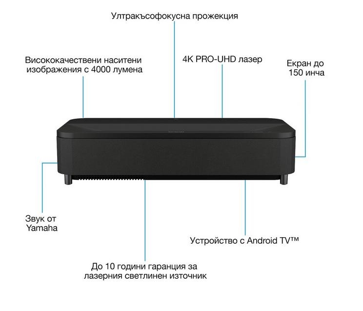 | Открийте възможностите за по-големи и вълнуващи забавления с домашното кино без голям черен екран, който непрестанно стои на стената. Суперултракъсофокусният лазерен прожекционен телевизор 4K PRO-UHD на Epson е с елегантен дизайн и има Android TV. Можете да се насладите на 80-инчово изображение на разстояние едва 2,3 см от стената, с опцията да регулирате разстоянието до постигане на до 150 инча за ненадминато домашно кино. Благодарение на високата яркост от 4 000 лумена и невероятния коефициент на контрастност от 2500000:1 този проектор 4K PRO-UHD с HDR10 излъчва реалистично съдържание и сенки с ясни детайли. Технологията 3LCD от Epson означава, че проекторите излъчват до три пъти по-ярки цветове отколкото сравними едночипови DLP проектори. С приложението Epson Setting Assistant настройването е още по-лесно – можете да подравните изображението автоматично с щракването само на един бутон. Android TV предлага хиляди филми, предавания и игри от Google Play, Amazon Prime Video, YouTube и други любими приложения. Насладете се на динамично аудио и 3D съраунд звук от YAMAHA, който може да се използва със или без визуален дисплей, като просто изберете екрана, който да заглушите, и също можете да свържете чрез Bluetooth, за да използвате като самостоятелен високоговорител. |