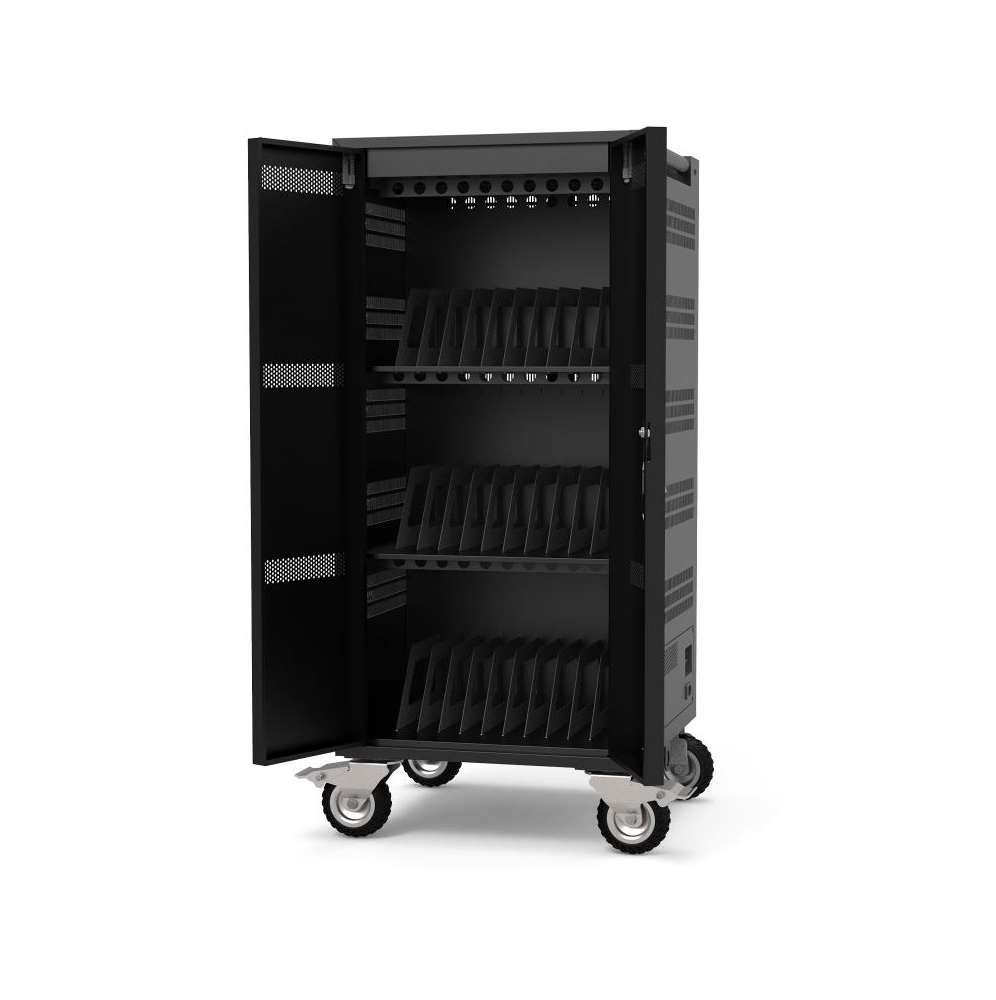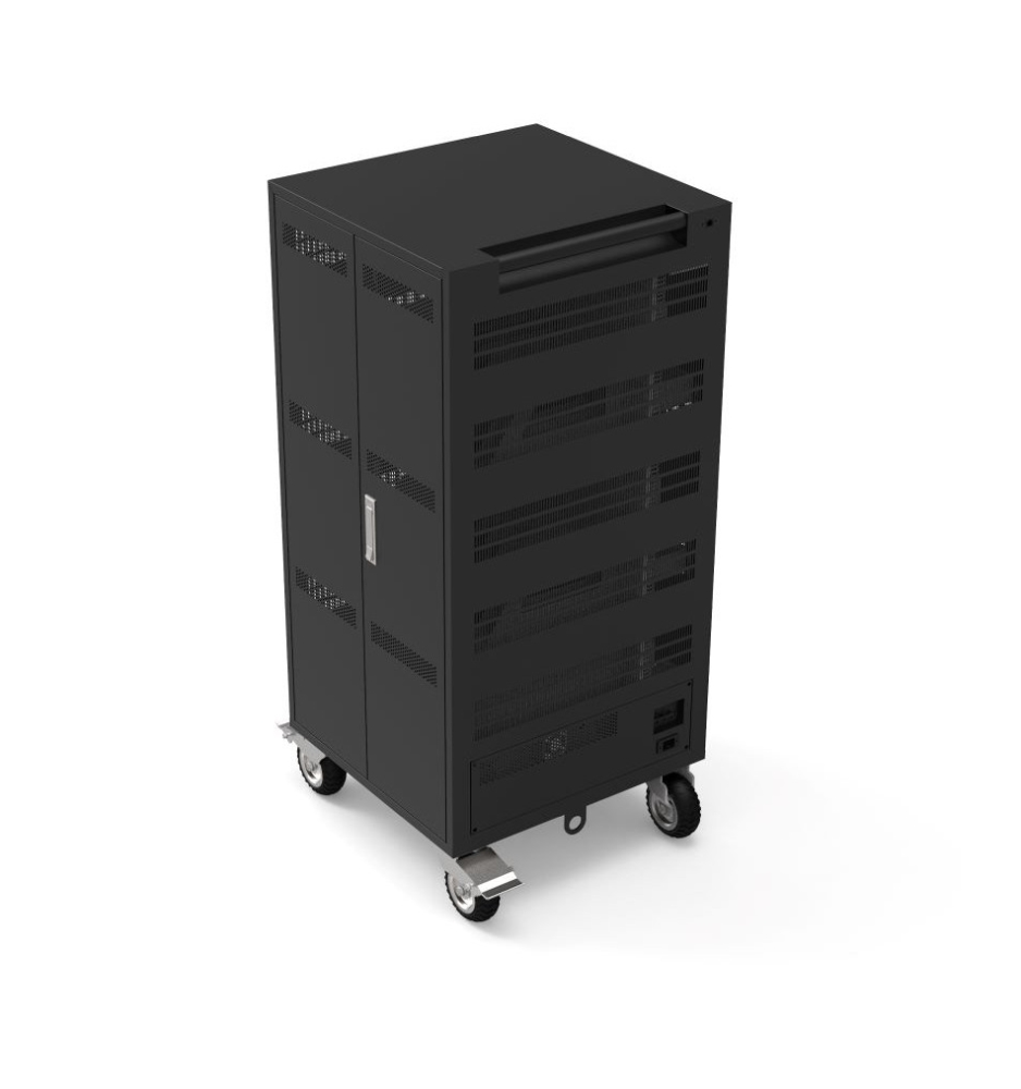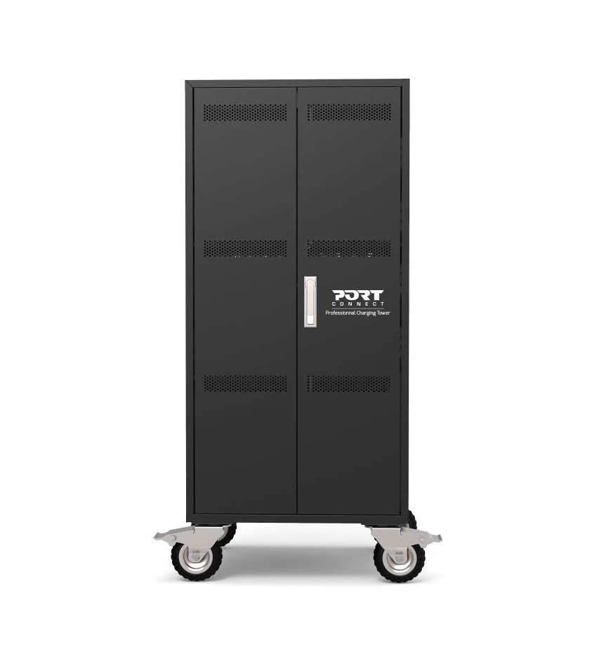 | Тази страхотна зарядна станция от Port ви дава възможността да зареждате и да съхранявате до 30 лаптопа едновременно. Сигурността на вашите устройства е гарантирана, благодарение на ключалката с 3 точки на заключване. Заключването ви помага да избегнете кражба, повреда или неправомерна промяна на устройството. Освен това разнопосочните колела със спирачки ви гарантират максимална стабилност при местене и употреба. В допълнение вградената защита от пренапрежение ви гарантира, че вашите устройства ще бъдат защитени максимално. Тази зарядна станция разполага с 30 мрежови контакта на гърба за захранване на преносими компютри. Безшумната система с мощен вентилатор ви гарантира контролирана температура и отлично охлаждане на компютрите ви, докато се зареждат. |