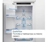 | Просторният хладилник с фризер LowFrost осигурява оптимално съхранение на храната и образуването на лед е значително намалено. Напомня ви, ако вратата не е затворена правилно или е възникнала друга грешка. Eco Airflow – оптимална циркулация на въздуха и постоянна температура в зоната за охлаждане. LED осветление: осветява хладилника равномерно без блясък, през целия жизнен цикъл на уреда. Чекмедже за замразена храна тип BigBox: за подреждане на контейнери за съхранение или за големи количества замразена храна. Автоматично супер замразяване: оптимално за замразяване на по-малко количество храна, като същевременно и предпазва замразените ви продукти от размразяване, благодарение на това, че открива повишаване на температурата и автоматично я понижава. |