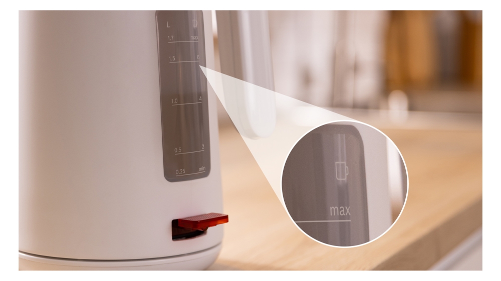| Кана с индикатор за чаши. Вълнуващият дизайн на повърхността с матово-гланцови акценти вдъхва живот на кухнята. Ергономична работа: лесно отваряне на капака с едно докосване на бутон. Индикатор за чаша: помага да спестите енергия и време, като кипнете само необходимото количество. Филтър за варовик: лесен за почистване филтър, който предпазва напитката ви от варовик. Лесна за четене водна скала: перфектна видимост на необходимото количество вода. Тройна функция за безопасност: Автоматично изключване, защита от прегряване, защита срещу кипене и изключване при повдигане. |