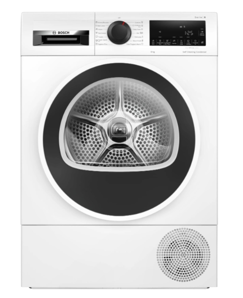 Dryer, Bosch WQG245D4BY SER6 Tumble dryer with heat pump 9kg A+++ 61dB, SelfCleaning condenser, drain set, interior light, Reverse tumble action, white-blackgrey door