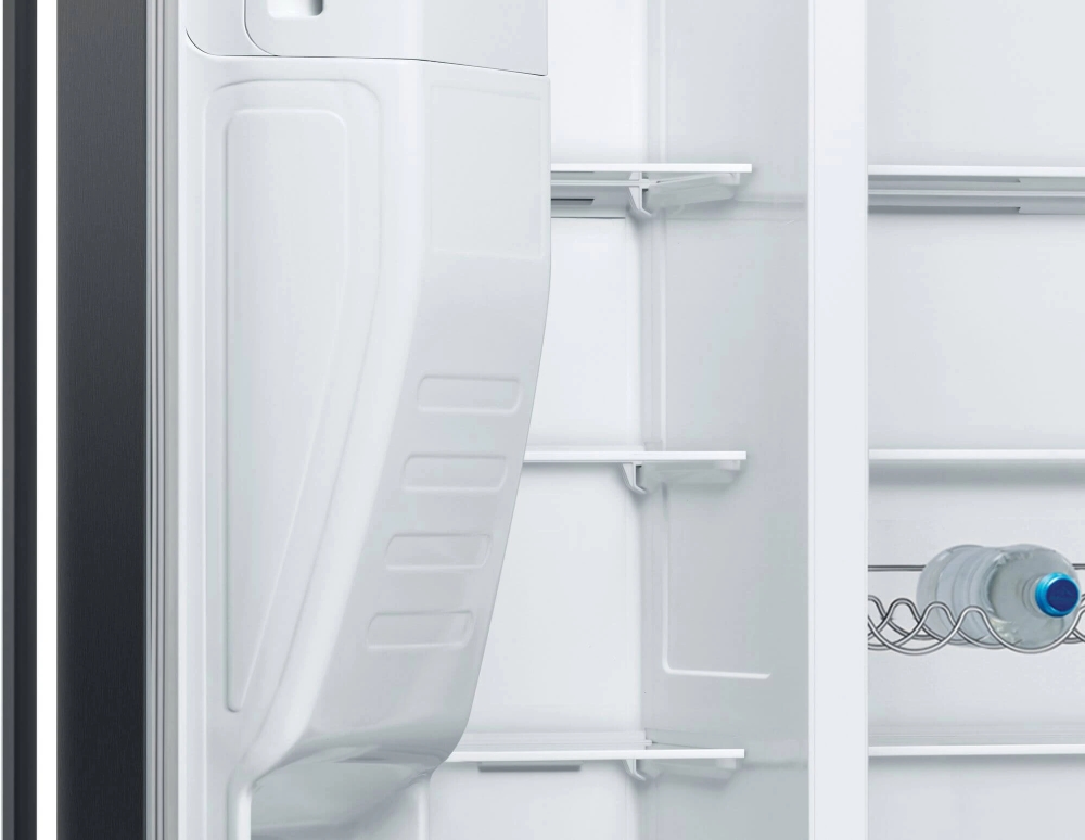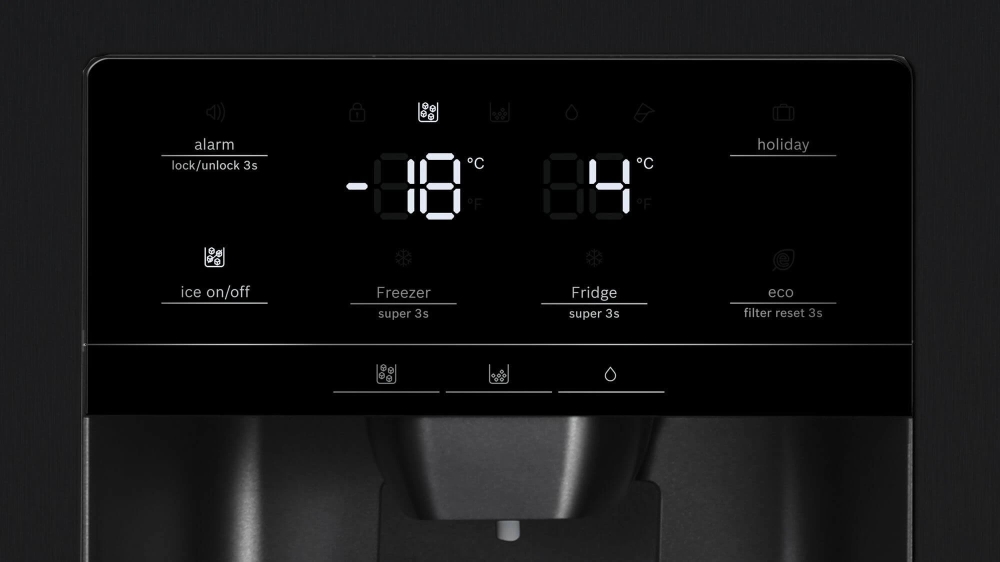 | Хладилник с фризер NoFrost, „side-by-side“ : осигурява модерен дизайн с дисплей на вратата и функция NoFrost, която спестява размразяването. Диспенсер за вода и лед: получавате охладена вода и ледени кубчета само с натискане на един бутон. Система NoFrost: никога повече няма да ви се налага да размразявате хладилника и фризера си. XXL вместимост: допълнително място за храна винаги когато ви е необходимо. Напомня ви, ако вратата не е затворена правилно или е възникнала друга грешка. LED осветление: осветява хладилника равномерно без блясък, през целия жизнен цикъл на уреда. |