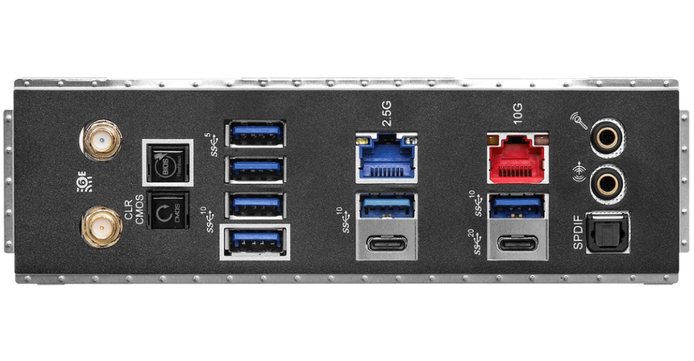 | Интерфейс | 2 x Antenna Ports, Optical SPDIF Out Port, USB 3.2 Gen2x2 Type-C Port, 4 x USB 3.2 Gen2 Type-A Ports, USB 3.2 Gen2 Type-C Port, 2 x USB 3.2 Gen1 Type-A Ports, 2 x RJ-45 LAN Ports, Clear CMOS Button, Microphone Input Jack, Line Out Jack |