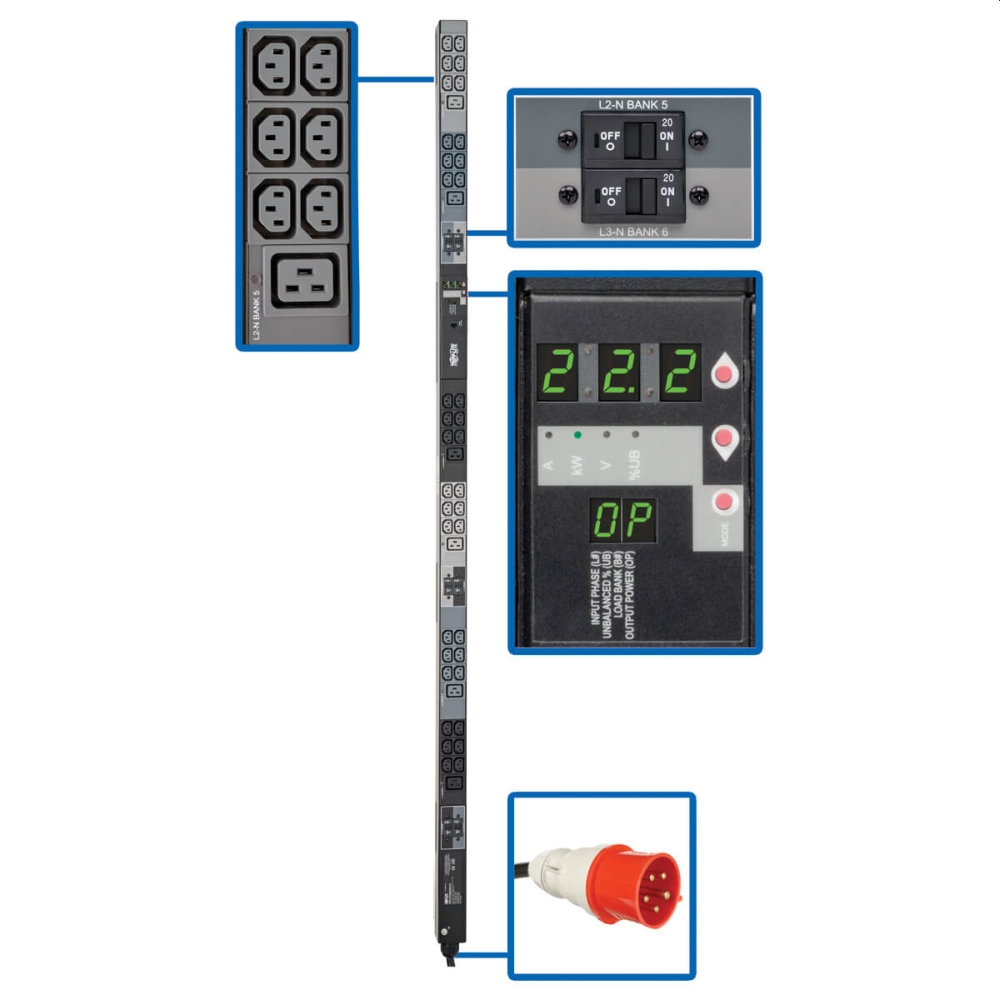 Filter, Tripp Lite by Eaton 3-Phase Local Metered PDU, 23kW, 42 208-240V outlets (36 C13, 6 C19), IEC309 32A Red (3P+N+E) 360-415V Input, 0u vertical, TAA