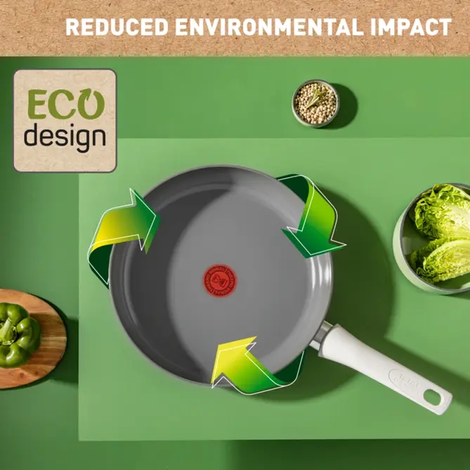 | Керамични съдове с екологичен дизайн, които променят начина на готвене. По-добро готвене с по-малко въздействие! Renew съчетава иновация с намален отпечатък върху околната среда за изцяло нов начин на готвене - такъв, който е с екологичен дизайн. Открийте плъзгане без усилие и здравословно готвене с ниско съдържание на мазнини благодарение на керамичното незалепващо покритие от ново поколение, което е създадено да издържи дълго. Лесен за почистване и съвместим с всички котлони, този комплект съдове за готвене осигурява перфектни и вкусни резултати благодарение на индикатора за топлина Thermo-Signal и се отличава с елегантен дизайн, произведен във Франция. |