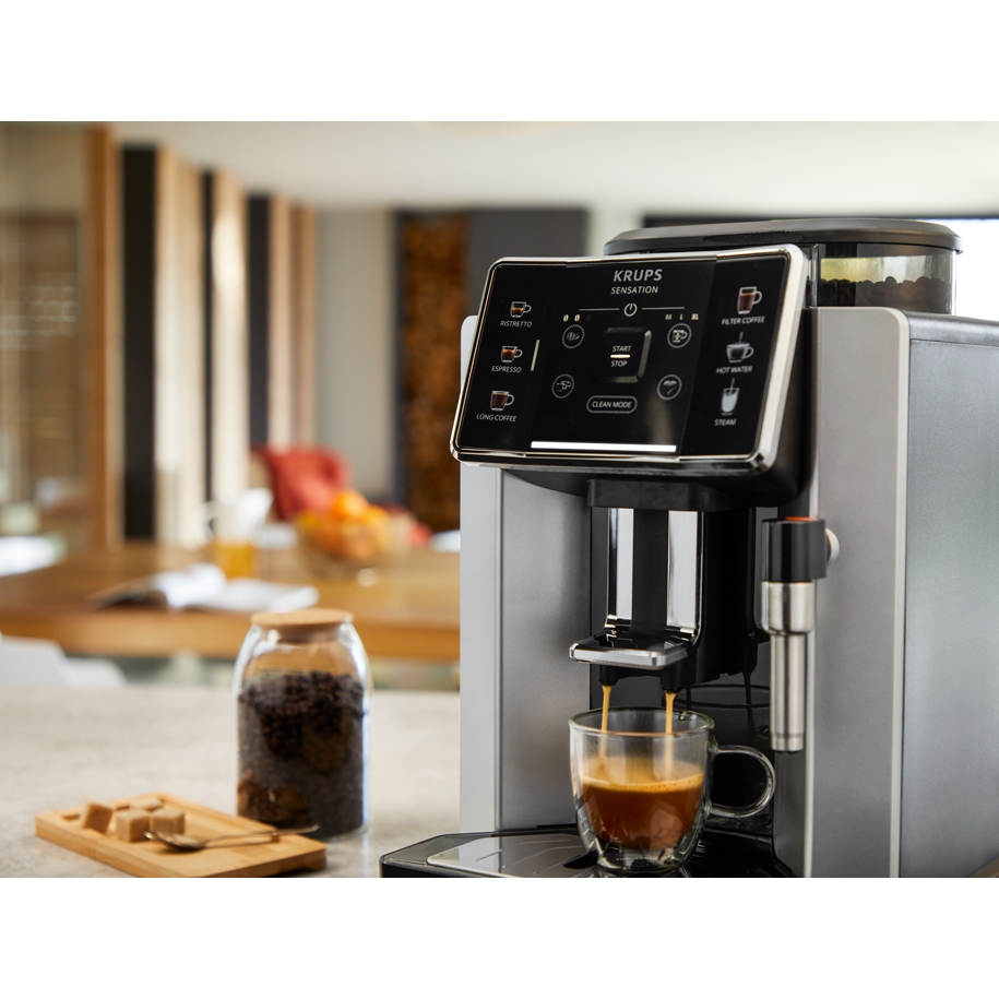 | Лесно приготвяне на перфектно кафе. Кафеавтоматът Krups Sensation ви предлага всичко - от перфектно ристрето до топло сутрешно филтърно кафе. Подходяща за всеки размер чаша, възможностите за приготвяне на кафе са наистина безкрайни. Нещо повече, вградената технология Barista Inside гарантира перфектно качество всеки път. С практични функции като удобния сензорен екран, персонализираните рецепти и светлинните индикатори, насладата от дневната доза кофеин никога не е била по-лесна. |