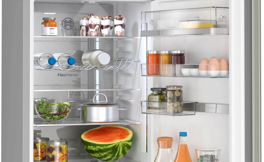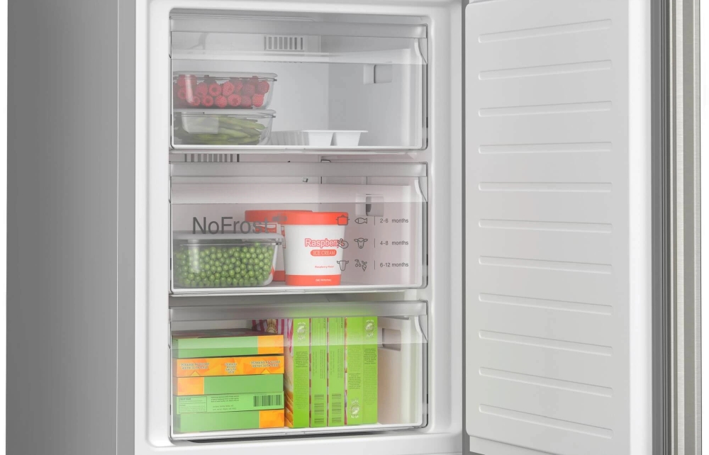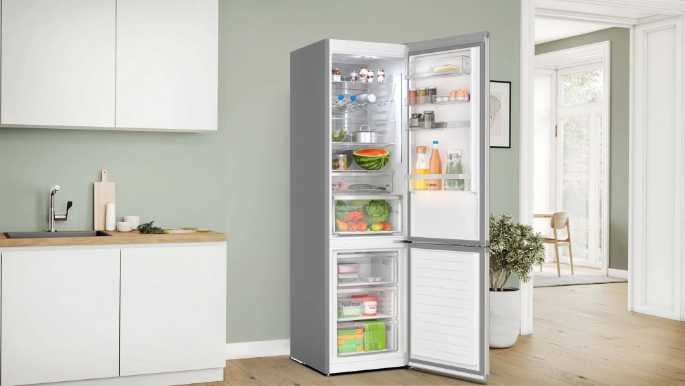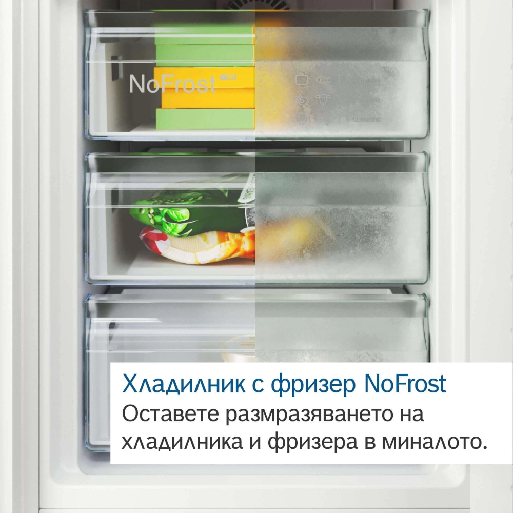 | NoFrost хладилник с фризер с VitaFresh: съхранява по-дълго продуктите и техните витамини. VitaFresh XXL <0°C>: хладилник, който запазва свежестта на храната по-дълго благодарение на по-големите чекмеджета с гъвкав контрол на температурата. NoFrost: никога повече няма да ви се налага да размразявате хладилника и фризера си. Метална задна стена с MultiAirflow:осигурява равномерна циркулация на хладен, свеж въздух за поддържане на постоянна температура. Flex Interior: регулирайте вътрешността на хладилника според вашите нужди благодарение на гъвкавите тави на вратите. PerfectFit: поставете хладилника си плътно до стени и други уреди, за да спестите място. |