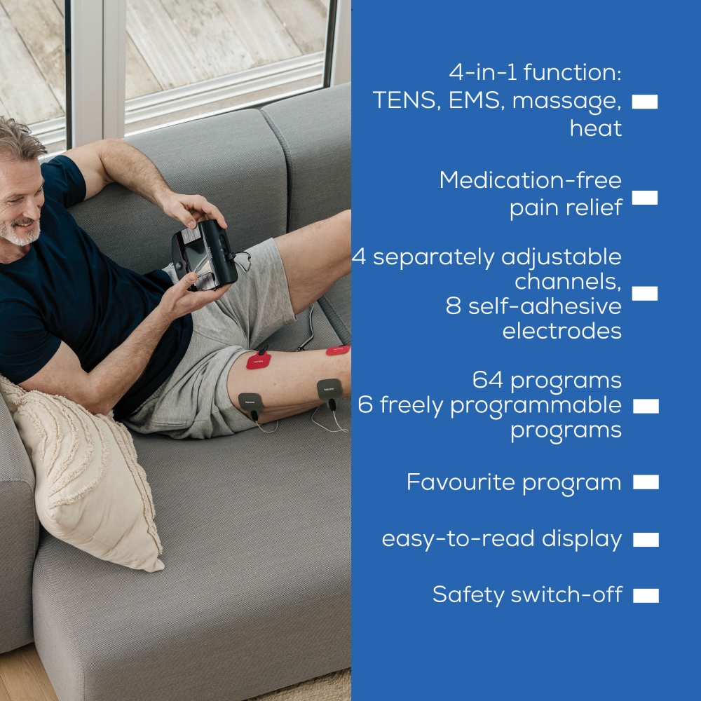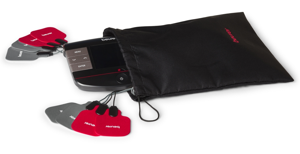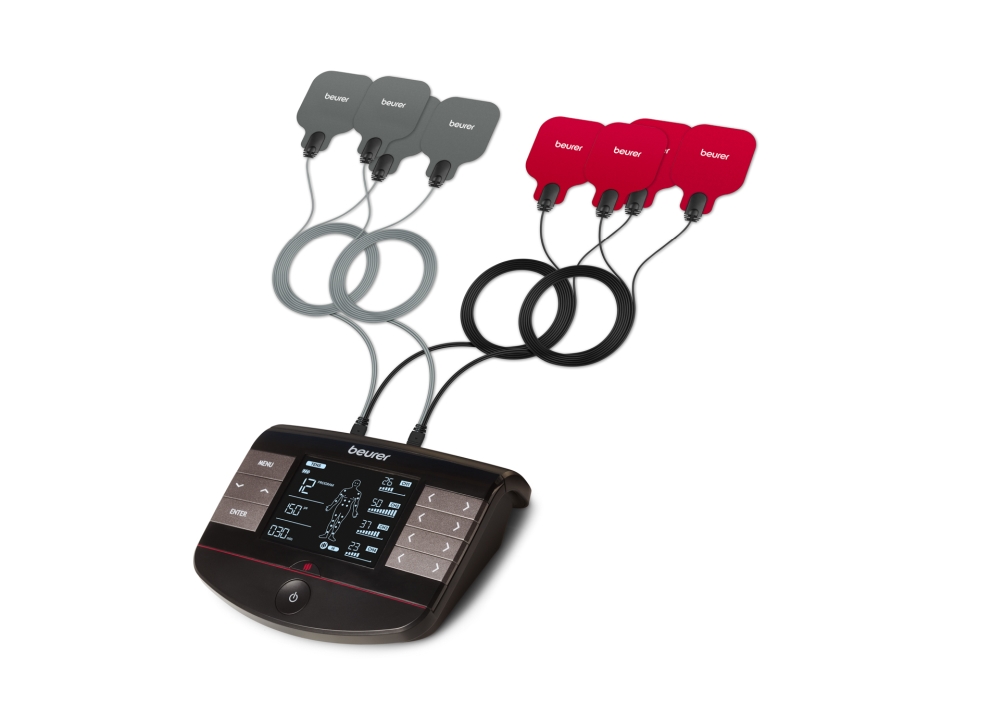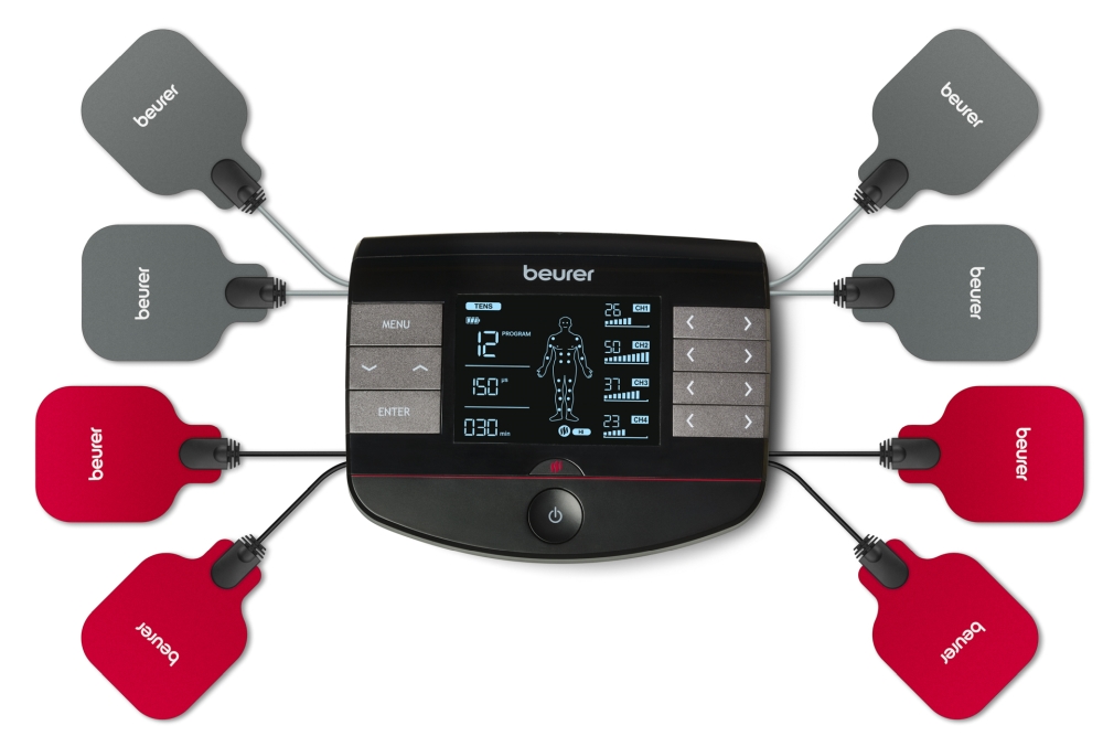 Масажор, Beurer EM 89 Heat Digital TENS/EMS device with heat function; 4-in-1 function: TENS, EMS, massage, heat; 4 separately adjustable channels with 8 self-adhesive electrodes; 64 pre-programmed applications Safety switch-off