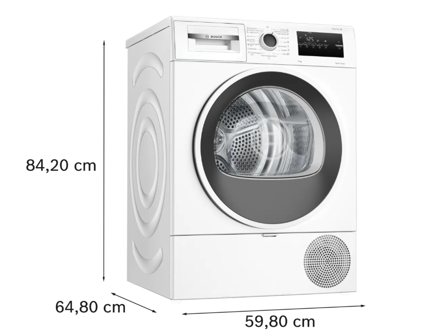 Dryer, Bosch WTH85209BY, SER4, Tumble dryer with heat pump 8kg, A++/D, 63dB EasyClean, drain set as acc. WTZ1110, white-blackgrey door