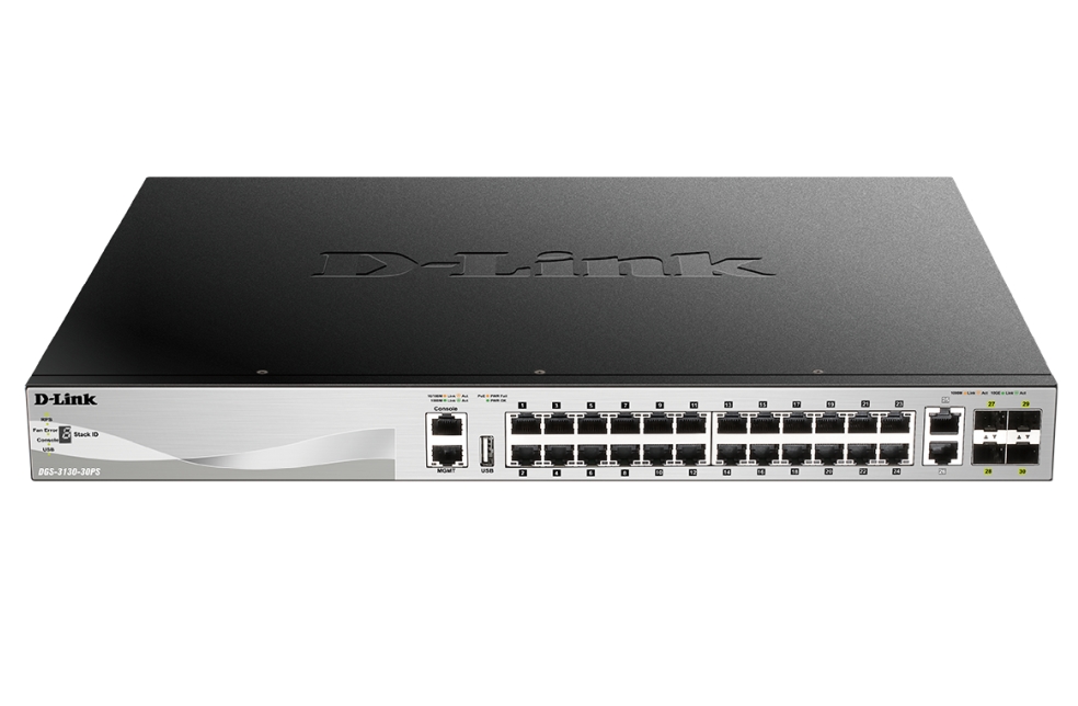 D-LINK мрежови продукти >> D-Link 24x10/100/1000Base-T PoE ports (370W budget) Layer 3 Stackable Managed Gigabit Switch with 2x10GBASE-T ports and 4xSFP+ ports