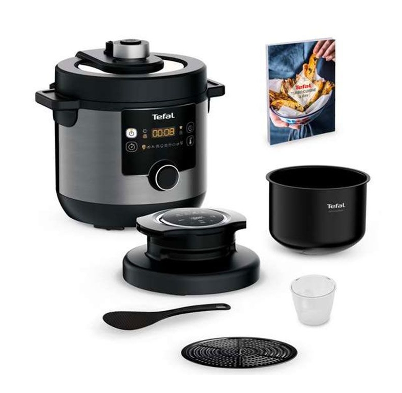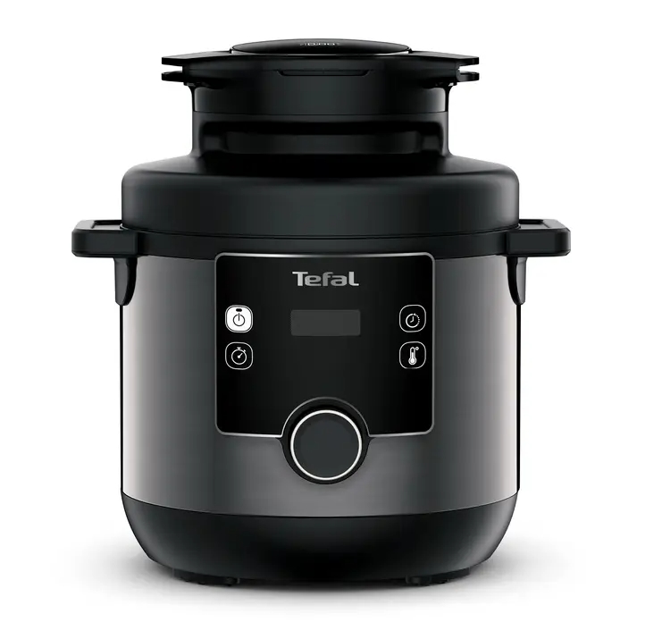 | Мултикукърът, който е тенджера под налягане, уред за готвене с горещ въздух и още - всичко това в едно. Запознайте се с новия си любим съюзник за лесно приготвяне на перфектни ястия: Tefal Turbo Cuisine & Fry! Този изключителен мултикукър с капак за готвене с горещ въздух предлага пълен пакет за здравословни и вкусни резултати с едно завъртане на копчето. Открийте рецепти за безкрайно вдъхновение и приятни за публиката ястия - от леки и хрупкави пържени картофи до печено месо и други. Използвайте Turbo Cuisine като тенджера под налягане за перфектни резултати до 3 пъти по-бързо* - всичко това без необходимост от наблюдение. |