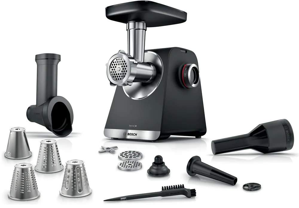 Meat mincer, Bosch MFWS640B, SER6, Meat mincer - MultiPower 2100 W, Planetary gearbox, 3,5 kg/min, kebbe attachment, sausage attachment, shredding attachment, reverse function, Black