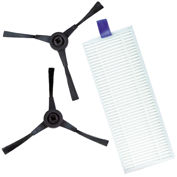 | Пълен комплект за ефективно засмукване! Улавя до 99,9% от частиците. Страничните четки достигат до труднодостъпни места като ъгли и первази. Благодарение на въртеливото движение, четките улавят праха и го пренасочват към смукателния отвор. Четките и филтърът трябва да се сменят веднъж на всеки 6 месеца (или 150 часа работа) за оптимална работа на прахосмукачката робот. |