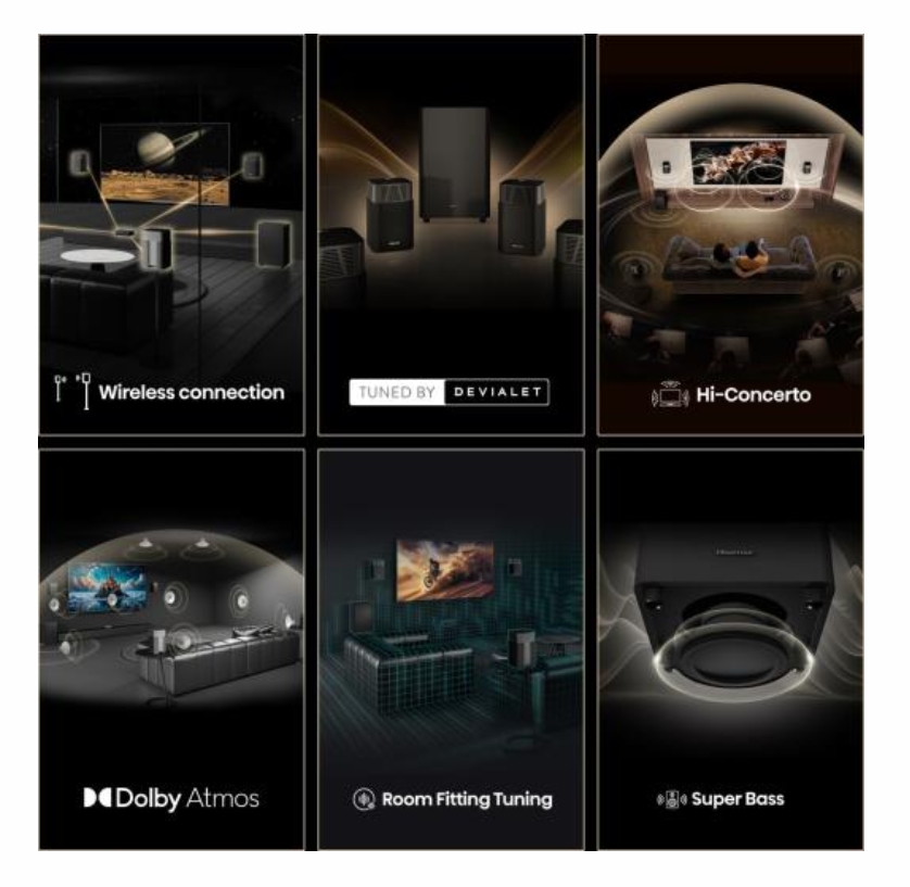 Аудио система, Hisense HT Saturn, 4.1.2Ch Sound Bar with Wireless Subwoofer, 720W, Dolby Atmos, Tuned by Devialet , DTS:X,Quad Satellite Speakers , Black