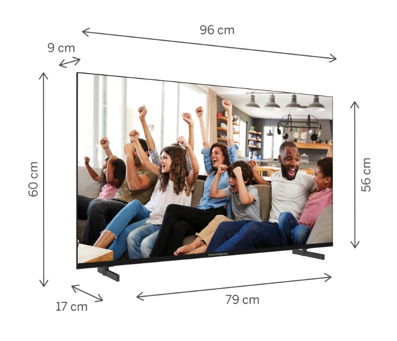 Телевизор, Thomson 43" UHD Google TV; 3840 x 2160 (4K UHD), 5000:1, DLED, 60 Hz, Dolby Audio, Google Cast, DVB-T/T2/C/S/S2, HDR10, Wi-Fi, Bluetooth, LAN, HDMI 2 (2.0) + 2 (2.1), USB 2 (2.0) + 1 (3.0), AV IN, Side Feet, Black