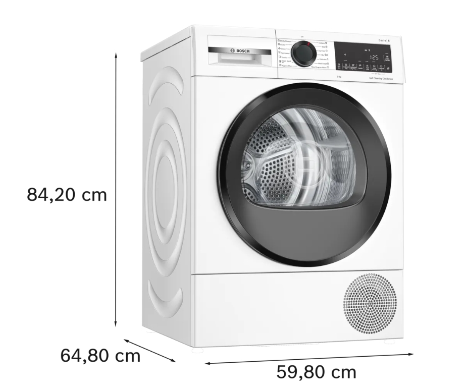 Сушилня, Bosch WQG24501BY, SER6, Tumble dryer with heat pump 9kg D / B cond., 63dB, SelfCleaning condenser, drain set, black-blackgrey door, black-black soft dial