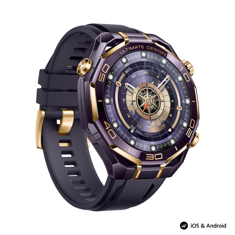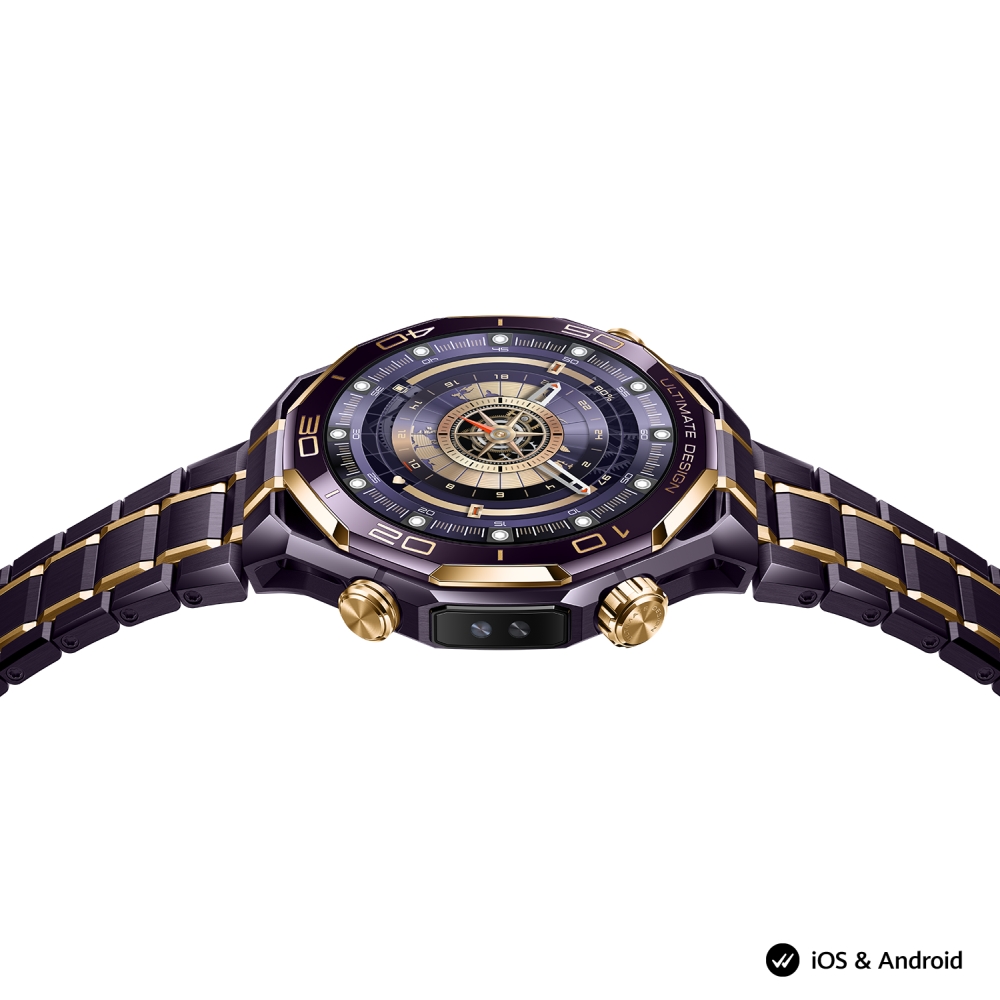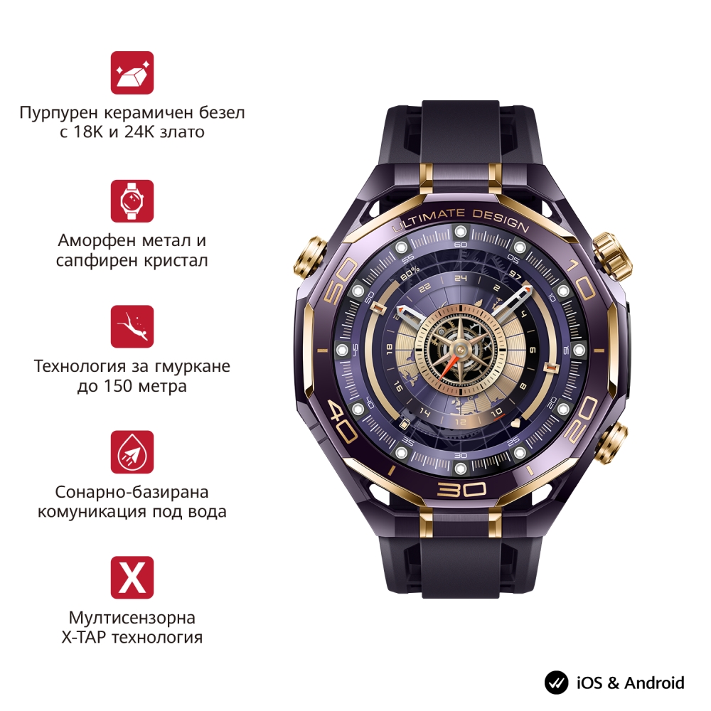 | HUAWEI WATCH ULTIMATE DESIGN е вашето сигурно пристанище в бурното море, със своята черна нанокристална керамична рамка, наподобяваща рул, и шест 18K златни инкрустации, отразяващи се светлини, които ви водят през нощта! Поставете го на китката си, защото е готов е да предизвика фурор! Истинско златно съкровище – този часовник е изкусно създаден, за да блести, излъчвайки лукс във всяко свое измерение. HUAWEI WATCH ULTIMATE DESIGN излъчва лукс във всеки детайл. Шест сегмента от 18K злато са инкрустирани по ръба на нанокристалния керамичен панел. Богато украсените символи, са гравирани по PVD технология, добавяки финалния щрих към тази вечна класика. Изящни 3D трапецовидни шарки върху короната са издълбани с диамантени инструменти и взаимодействат с вграденото злато, за да създадат бляскав вид и лъскаво усещане. Докоснете се до позлатената черна верижка, за да блестите дори в най-мрачната нощ. С 12 нива (прецизност на регулиране: 1.45 мм на ниво2) и 17.4 мм настройки можете да постигнете идеалното прилягане, без да се налага да отваряте кутия с инструменти. Хвърлете поглед към земното кълбо на китката си с линии за дължина и ширина, гледайте как сърцето ви пулсира на екрана или изберете бляскавата златна тема за живота – с толкова много ослепителни циферблати, от които да избирате, това наистина е най-доброто от всички светове! Часовникът записва безброй данни за замах при игра на голф, включително скорост на замах, темп на замах, време за замах назад и време за замах надолу. Режимът на обхват на движение следва замаха ви до последния детайл, с удобни демонстрации и съвети как да постигате нови висоти в начина ви на игра. Насладете се на спокойствие, когато се гмуркате, с водоустойчивост 10 ATM, сертифицирана поддръжка за аксесоари за гмуркане на 100 метра, разнообразен набор от режими на гмуркане, включително водолазно гмуркане и свободно гмуркане, както и богатство от подводни данни. Режимът Expedition е вашият универсален спътник за приключения на открито, с прецизно позициониране на двулентов петсистемен GNSS9 и специална настройка за слабо осветена среда, като пещери, лагерни огньове и горски заслони. Дори можете да маркирате местоположенията си и да ги използвате, за да намерите пътя обратно, да се отклоните свободно, без да изгубите пътя си. Часовникът е съвместим с iOS и Android за максимално удобство на всички потребители. Отговаряйте и отхвърляйте входящи повиквания, изпращайте персонализирани бързи отговори и преглеждайте списъка с обаждания, за да останете на линия, дори когато излизате. HUAWEI WATCH ULTIMATE DESIGN предлага светкавично бързо безжично зареждане и издържа до 14 дни16 при пълно зареждане, преди да се нуждаете от повторно, което го прави надежден спътник във вашите приключения на открито. |