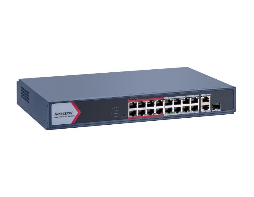 Комутатор, HikVision 16 Port Fast Ethernet Smart POE Switch, 16 x 10/100M PoE ports, 1 x Gigabit RJ45 port, 1 x Gigabit combo, Total PoE Power Budget 130 W, Up to 300 m Long Range PoE Transmission, 6 kV Surge Protection