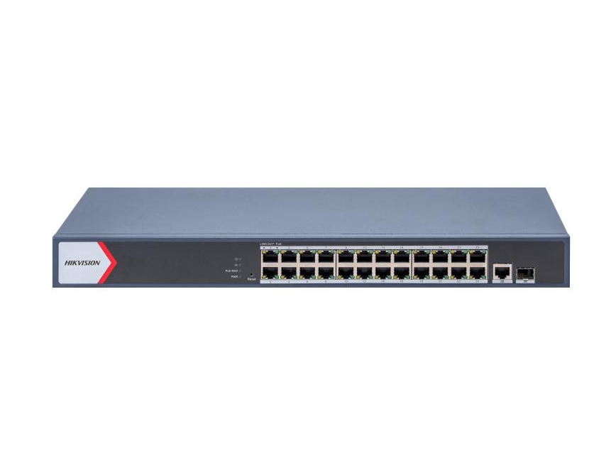Комутатор, HikVision 24 Port Gigabit Smart POE Switch, 24 x Gigabit PoE port,1 x Gigabit RJ45 port, 1 x Gigabit fiber optical port, Power Budget 370W, Up to 300 m Long Range PoE Transmission, 6 kV Surge Protection