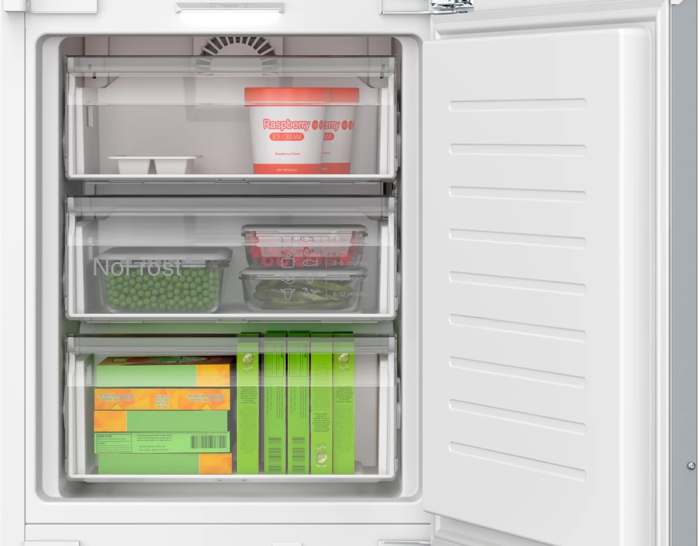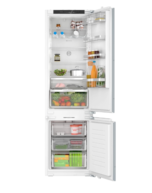 | Големият вграден хладилник с фризер с 11% повече охлаждащ обем, включително системата VitaFresh XXL <0°C>, No Frost и предупредителен сигнал за грешка за оптимално съхранение. Вграден XL обем: осигурете си 11%допълнително пространство за съхранение благодарение на по-високия дизайн. VitaFresh XXL <0°C>: хладилник, който запазва свежестта на храната по-дълго благодарение на по-големите чекмеджета с гъвкав контрол на температурата. Eco Airflow – оптимална циркулация на въздуха и постоянна температура в зоната за охлаждане. Аларма за отворена врата: Напомня ви, ако вратата не е затворена правилно. Freezer Light: Ярко осветление във вашия фризер. |