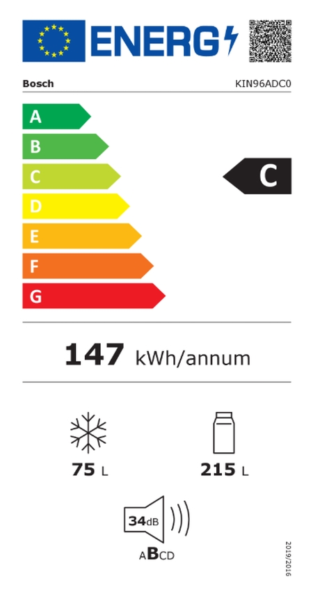 Хладилник, Bosch KIN96ADC0 SER6, BI fridge-freezer XL, NoFrost freezer, C, 193,5cm, 290l(215+75), 34dB(B), IC, VitaFresh XXL 0°, EcoAirflow, bottle shelf, Door Open Alarm, SoftClose flat hinge