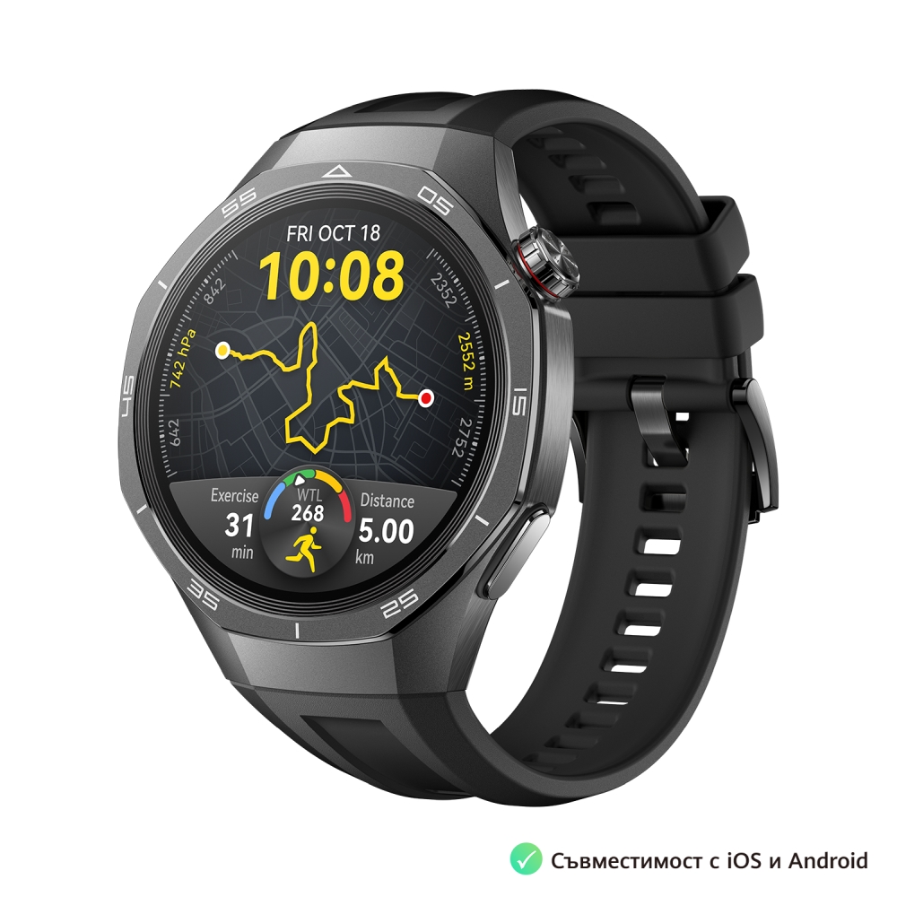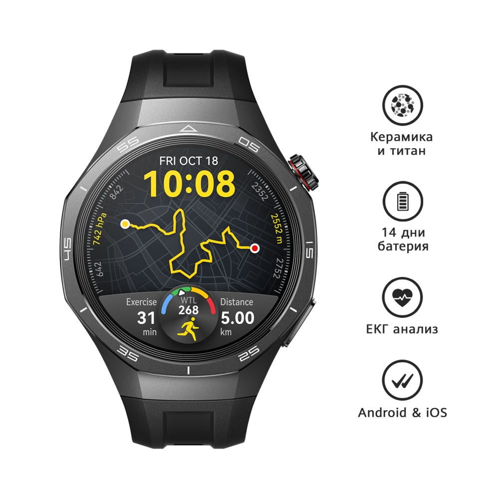 Часовник, Huawei Watch GT5 Pro Vili-B29F, 1.43", Amoled, 466x466, PPI 326, BT5.2, BLE/BR/EDR, 524mAh, TruSense System, ECG analysis, Battery life up to 14 days, Compatible with iOS and Android devices, Black Fluoroelastomer + Huawei FreeBuds SE 3 ULC-CT020 Black